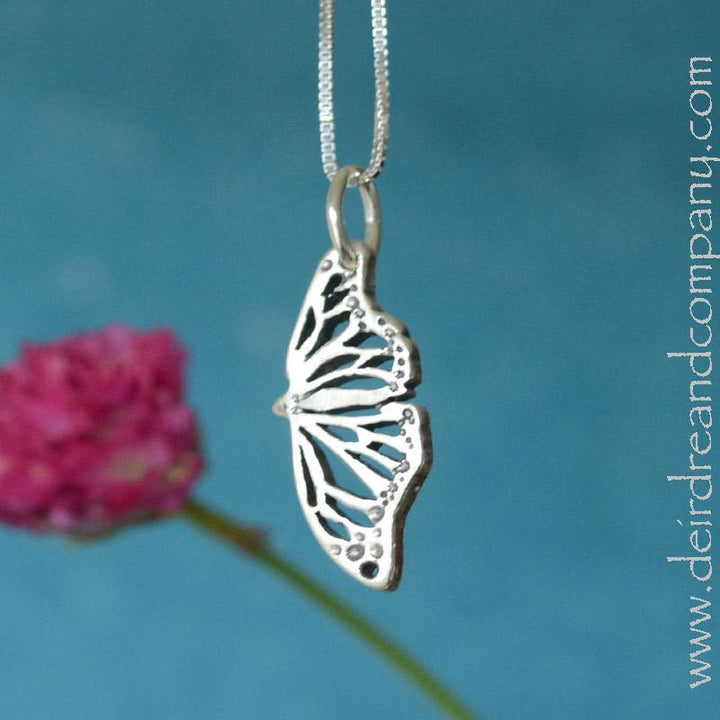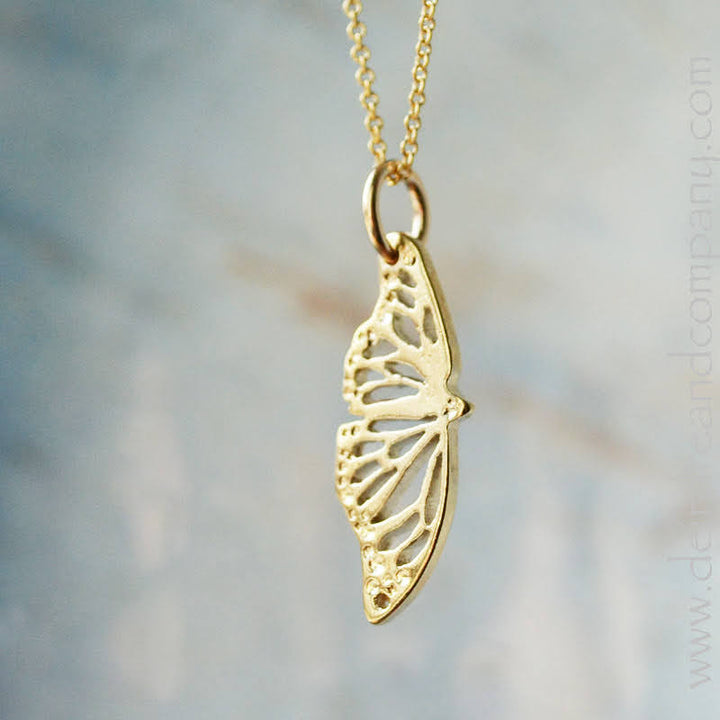 This lovely Monarch Butterfly Pendant Necklace in Gold is quite a bit less elusive; it will lie close to your shoulders as long as you'd like. 14K Gold Vermeil butterfly charm (1" x 3/8") on 18" 14K gold-filled chain. Want it in sterling silver? You can select silver from the Material menu below. Comes boxed with your choice of insert card.
