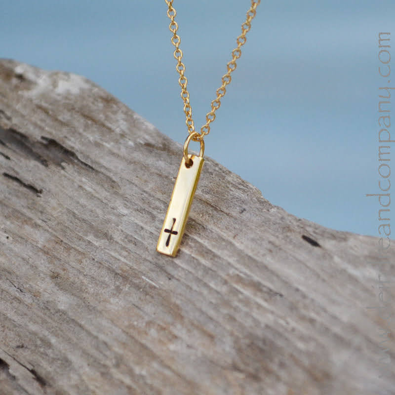 Handmade cross necklaces are our specialty, and while most of our crosses come in silver, we love them in gold as well. The gold reminds us that our faith is precious to God, and He uses the hard things in our lives to refine our faith like gold. So when you wear this gold, Little Cross Blessing Bar, remember how precious you are to God.
