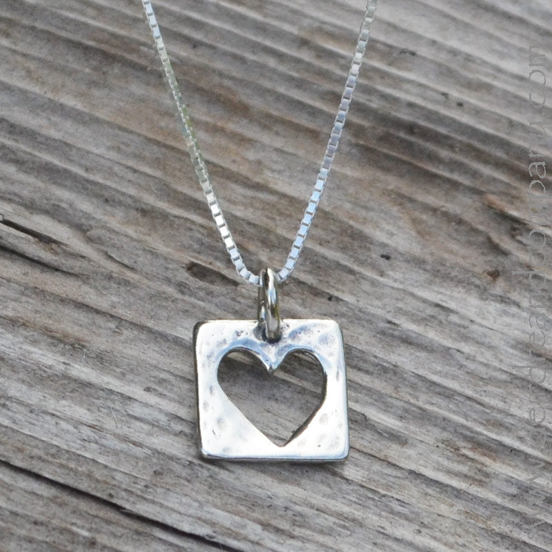 Cut-out hearts in cute little hammered squares are a fun expression of living with an open heart. Heart lovers young and old are delighted by this Live with An Open Heart Necklace. Sterling Silver heart charm (3/8” x 3/8”) on sterling silver box chain. Comes boxed with your choice of insert card. We have Matching Earrings too!