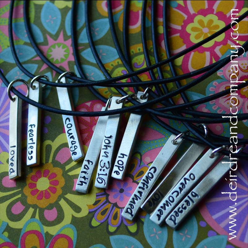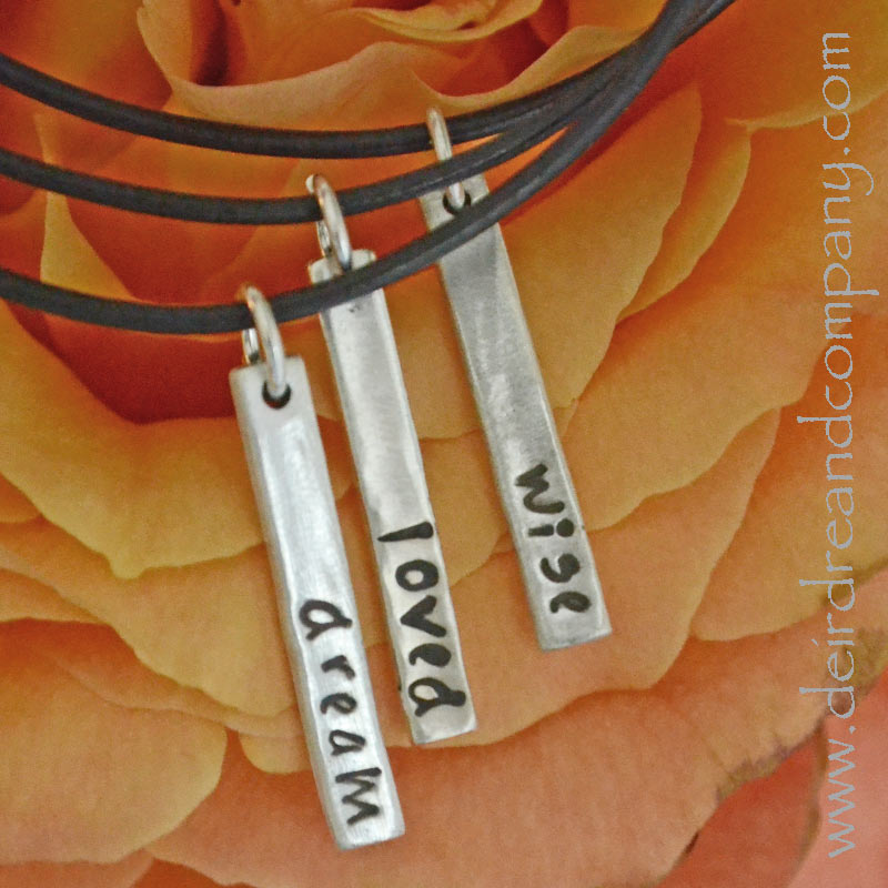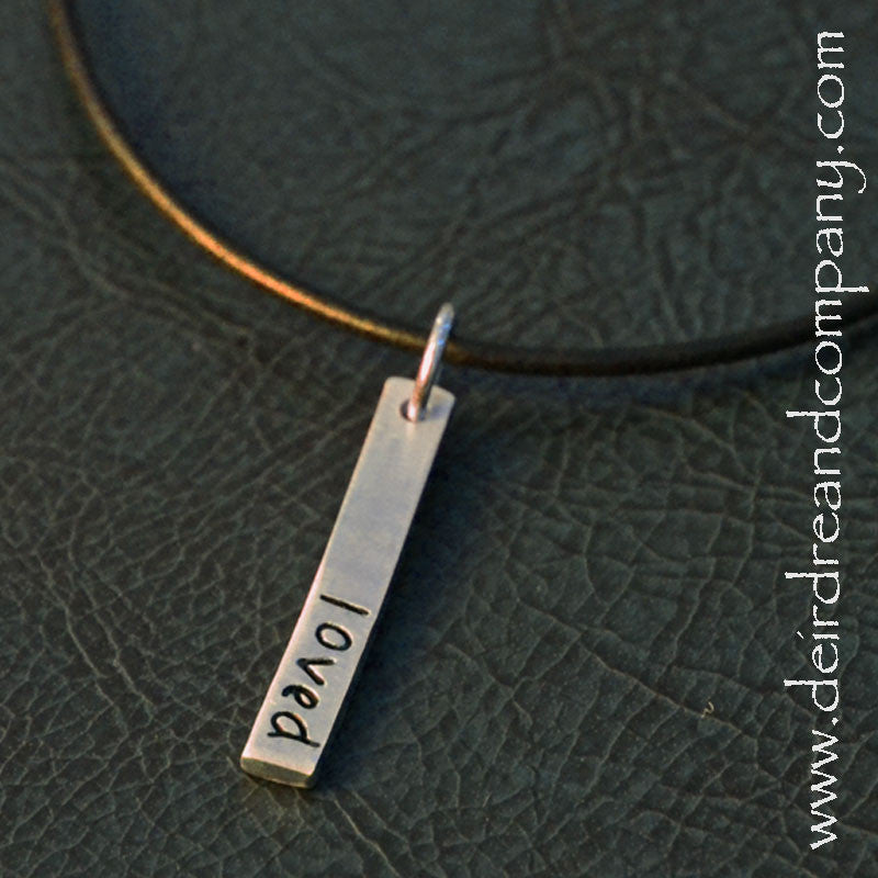 Our original Blessing Bar Necklace, made with love and meant to bless, keeps your blessings close to your heart. Each 1 1/8" x 3/16" bar is handcrafted in sterling silver and comes hand-stamped with the word of your choice, on sterling silver box chain.