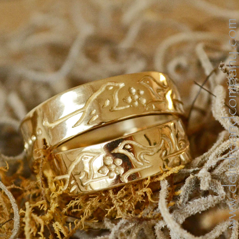 Handcrafted Gold Wedding Rings Featuring Etched Birds