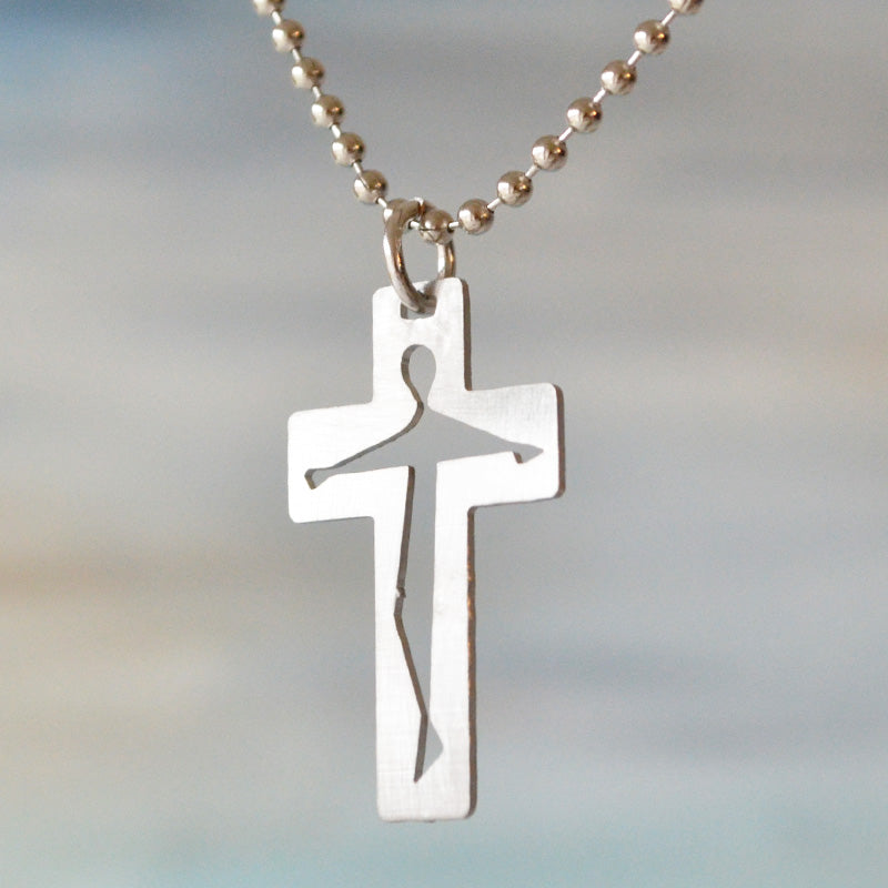 The Crucifix Cross pendant Small 1 3/8" x 7/8", Large 2 5/8" x 1 1/2"comes in stainless steel. Brushed finish on choice of card. Comes in a sleeve.
