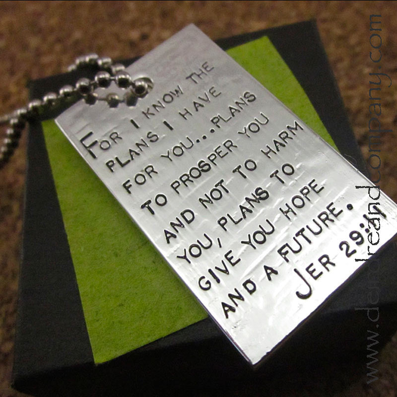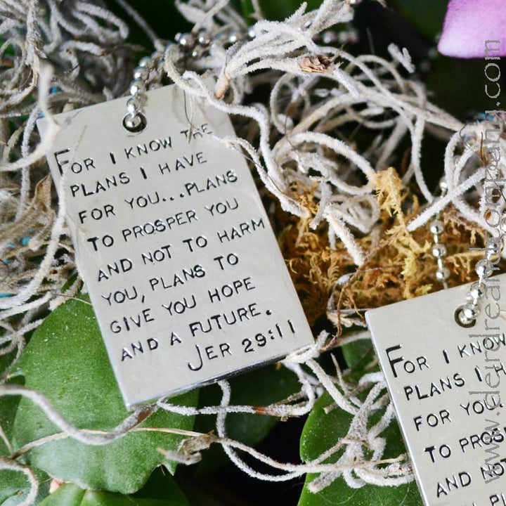 This message still encourages us, thousands of years later, with the added promise of hope we have in Jesus. Susie Larson wrote, "Run to Jesus with everything in you and get a vision for where He's taking you." (Prevail: 365 Days of Enduring Strength from God's Word, Day 178) Our Jeremiah 29:11 Silver Plated Dog Tag was created as a reminder that God is for us and our hope is always in Him, whatever our circumstances.