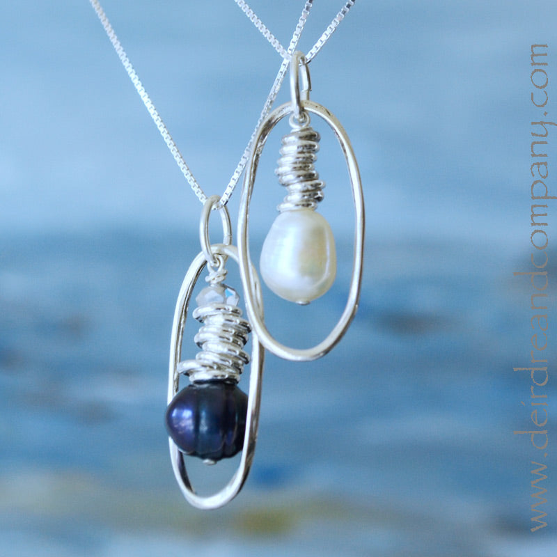 Simple and elegant, this Pond Pearl Necklace has been a favorite. Freshwater pearl and sterling pendant (1 1/8" x 1/2") on 18" sterling silver box chain. Choose either a Peacock (Blue) or White pearl from the drop down menu. Comes boxed with your choice of insert card.