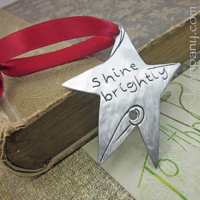 This Shine Brightly Star Ornament created in pewter can be a bookmark, a decoration, or just tucked away as a special treasure. It also can be slipped in a card (perfect at graduation time) and mailed (with no extra postage in most cards). At this price, think of all the people you can encourage. The pewter star is about 2 1/2” high; with ribbon it is about 5” long. Comes packed in a clear sleeve with bookmark.